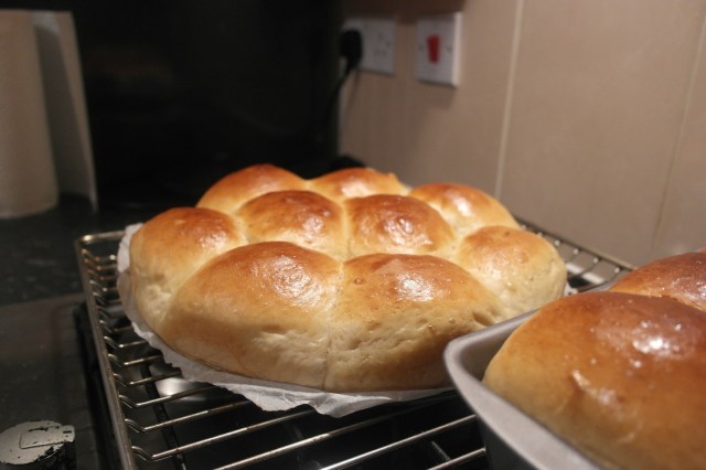 - I greased my pans, and placed them inside, I covered them again with a wet tea towel for about 50 minutes, they will get to double the size.
