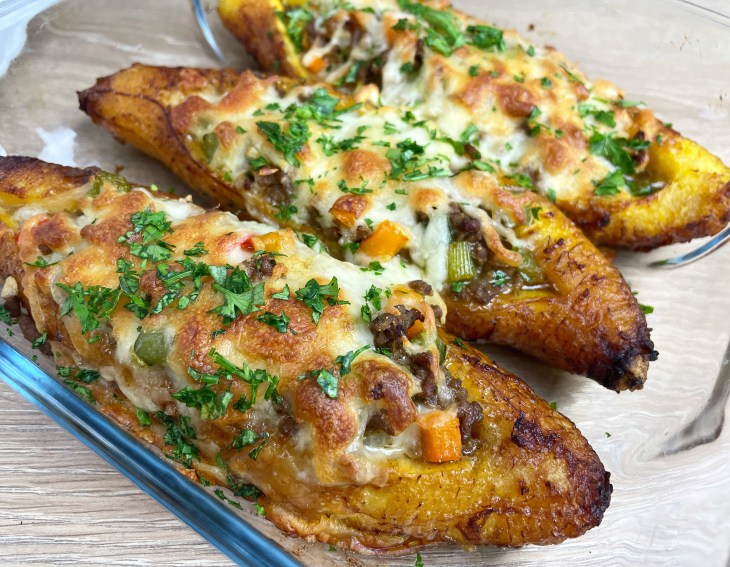 - Using a knife, make a straight line in the middle of your plantain, scoop stuffing into the middle and top with cheese.