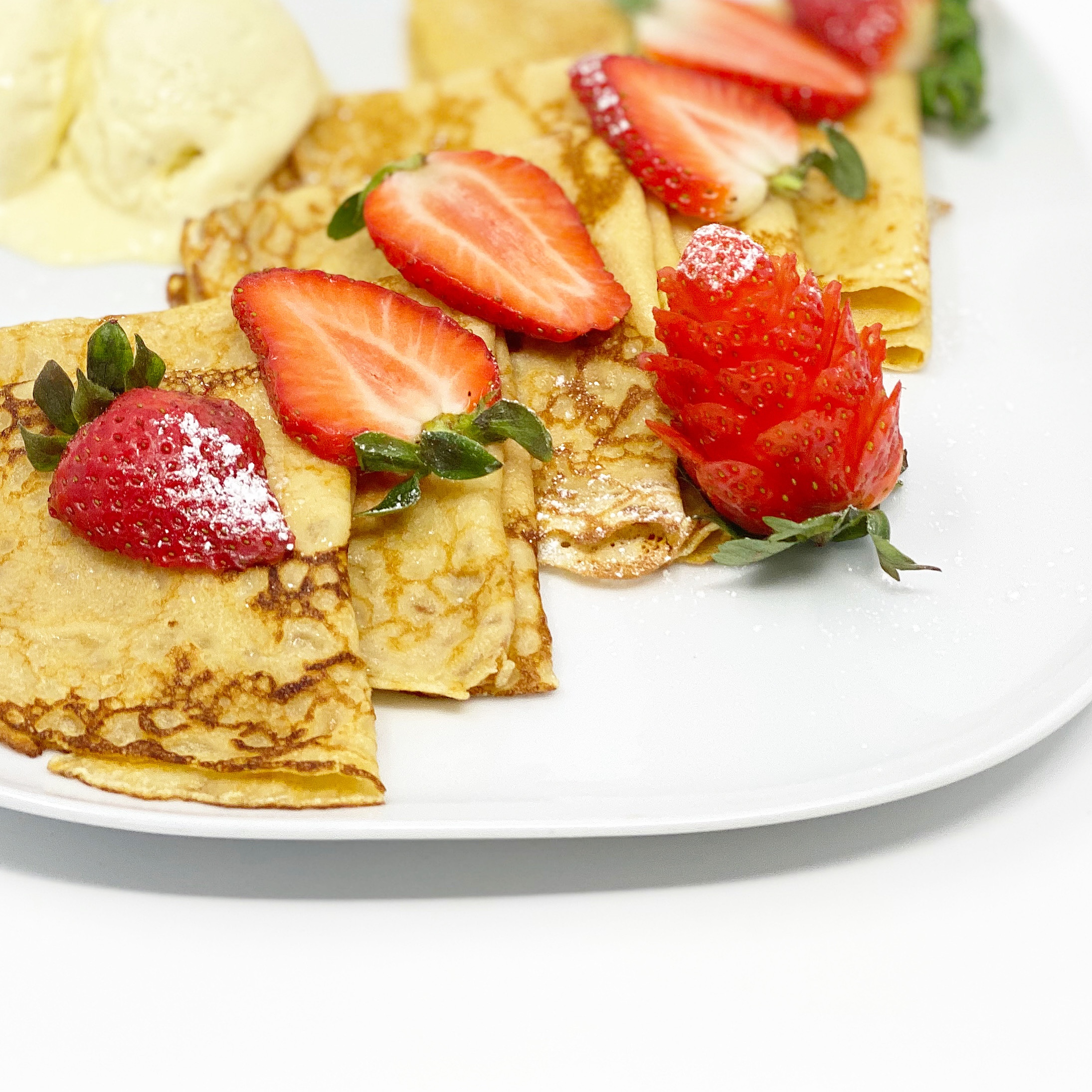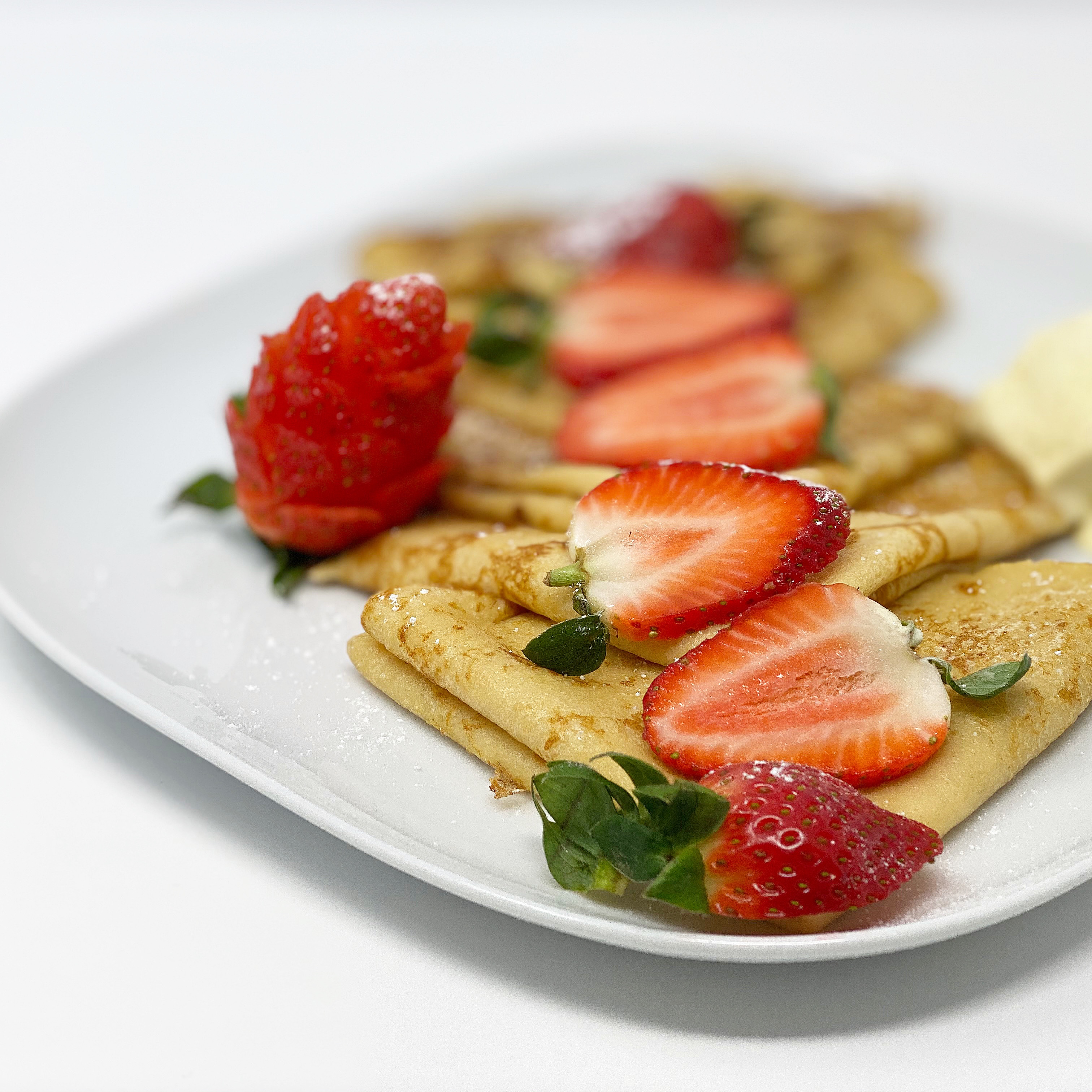◦ Serve crêpes warm with fresh fruit, ice cream and dust icing sugar and serve.